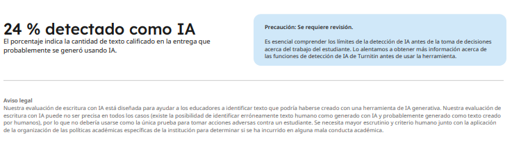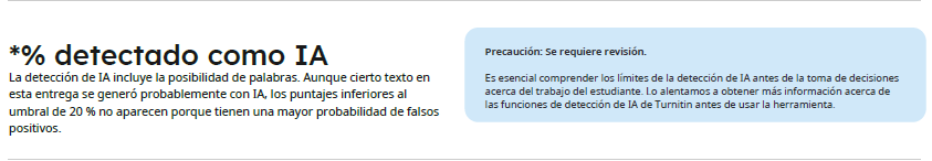 Cuando el porcentaje de detección de IA es menor al 20%, no lo considera como contenido generado por inteligencia artificial. En lugar de mostrar un número, aparece un asterisco (*), y no se resalta ningún fragmento del texto. Esto se debe a que el sistema interpreta estos niveles bajos como posibles falsos positivos, por lo que el documento puede tomarse como libre de IA.